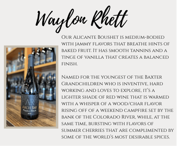 Over this past summer and fall, Arch Ray Resort released their most recently crafted line of varietals and blends. While the former vintages have woven in and out of the history of Baxter Ranch, several of the newly released wines render a nod to the promising future as they bear the names of the Baxter’s grandchildren and cast an artistic spotlight on the young souls who are being trained to pick up the baton and carry on the lasting heritage of the family for many more generations.