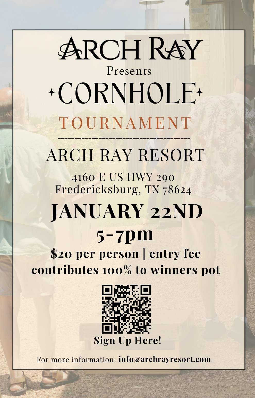 Grab your cornhole partner and join us on January 22nd for our tournament! Enjoy drinks and food from the resort while you play. Winner will be awarded cash prize! $20 per person for entry with 100% of the fee going towards the winner's pot. Sign up here. We can't wait to see you there.